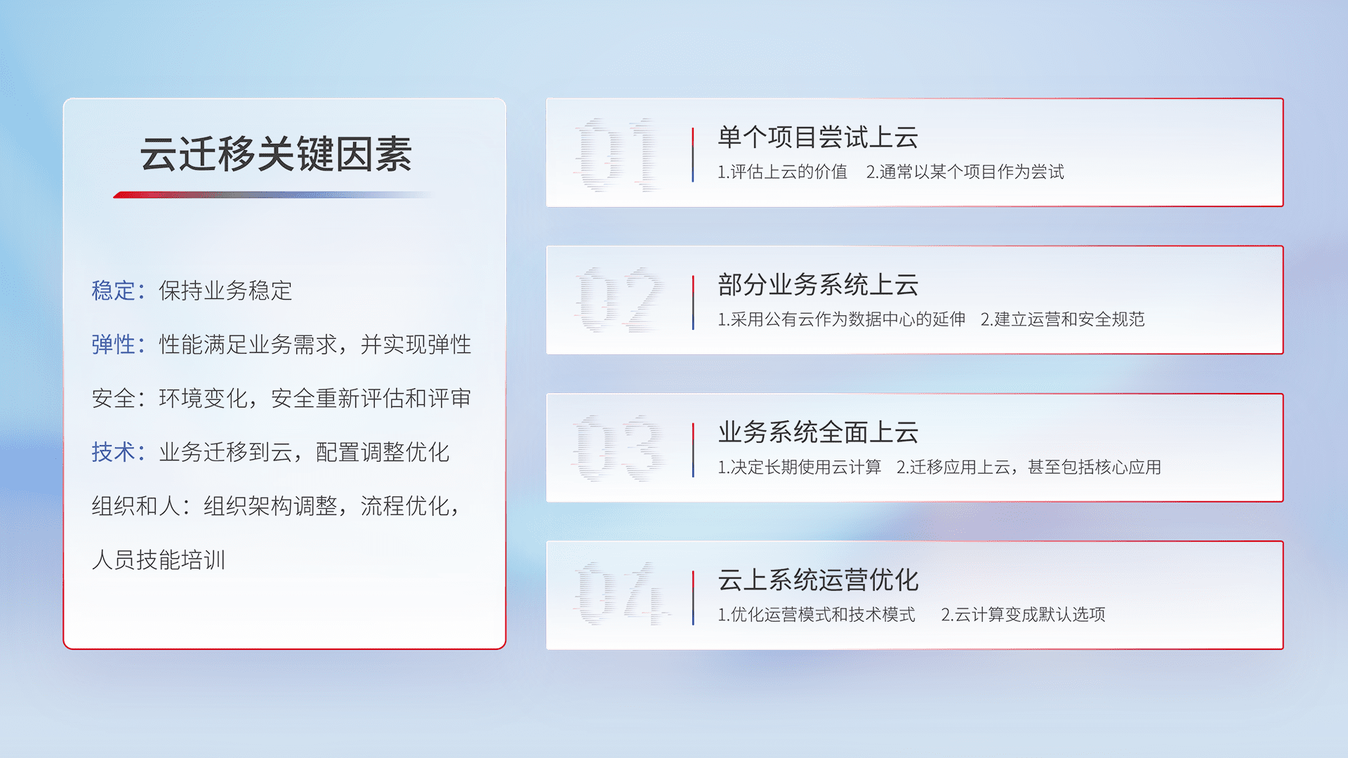 结合实际业务,,,,从规划设计、、云平台选型、、、云原生改造、、、数据迁移、、集成交付,,,,迁移全过程为客户识别最佳上云路径,,做好风险识别管理,,,,设计网络架构、、身份权限、、、、安全审计合规、、、操作审计、、、日志审计、、、监控告警策略、、、、多站点容灾设计等,,对云上基础设施进行整体规划,,,提升IT治理水平,,,以满足弹性、、、、高可用、、、、高性能的需求。。。