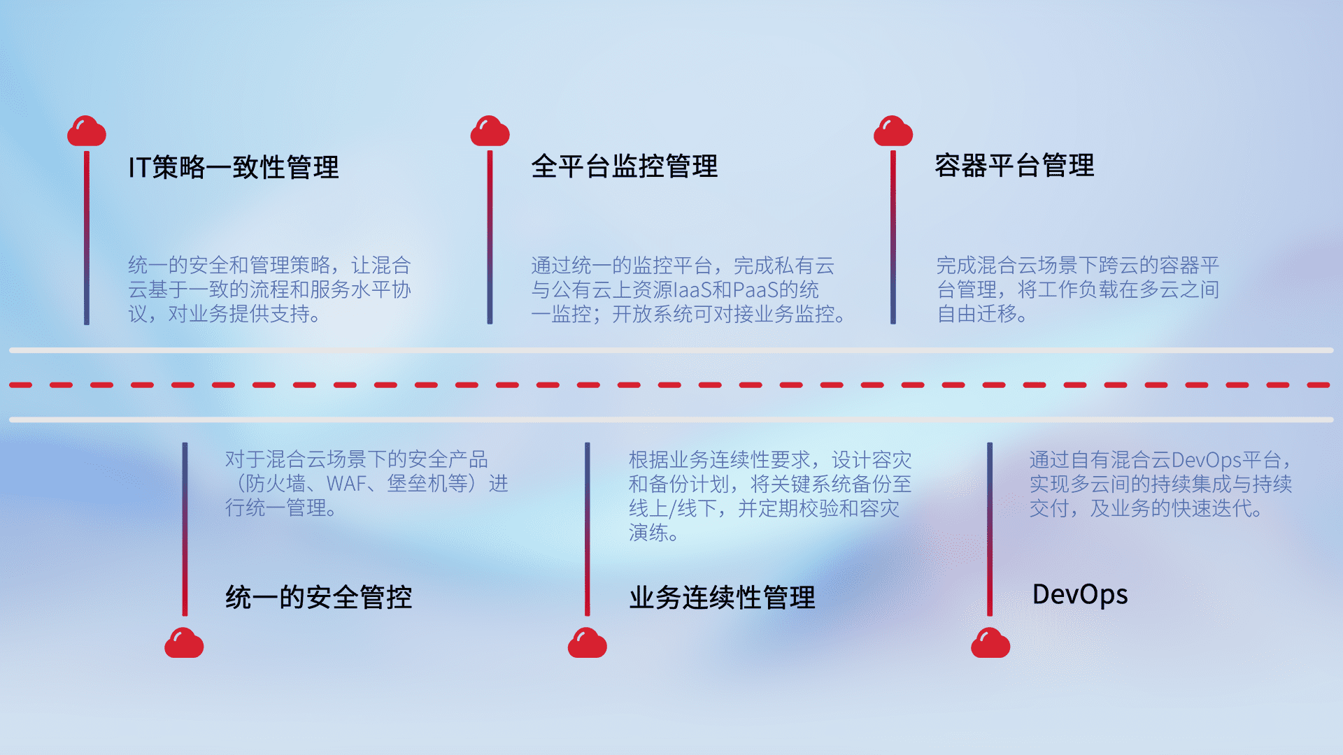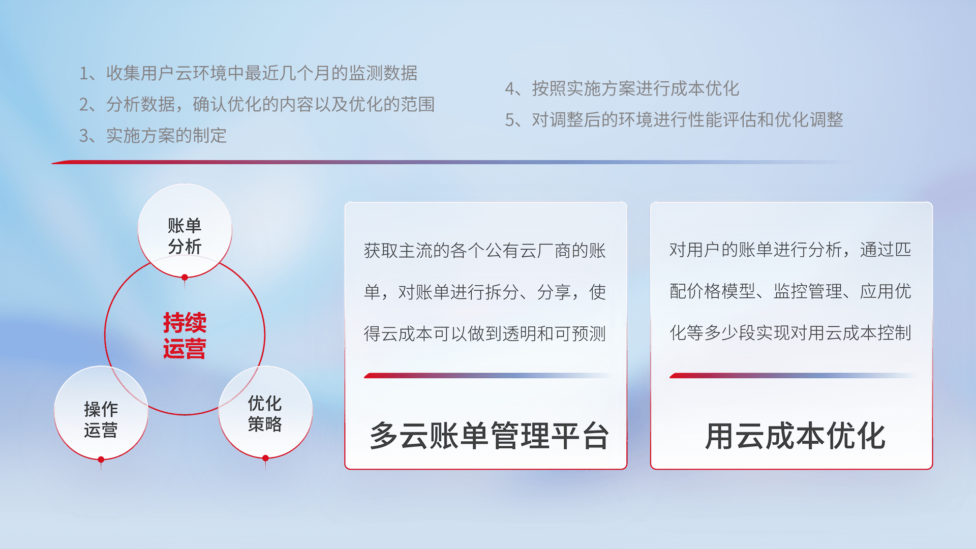 通过多云纳管,,,以统一的资源数据模型把客户的云资源进行抽象和封装,,进而实现对多云资源的统一操作,,,保障云资源管理的可靠性、、稳定性与可用性。。。量身定制化运维内容,,配置、、、开发运维、、补丁管理、、备份、、、、监控、、、、认证和访问管理、、、、审计和日常巡检等,,,,保障在用云过程中的可靠度,,,稳定度以及高可用率。。。。