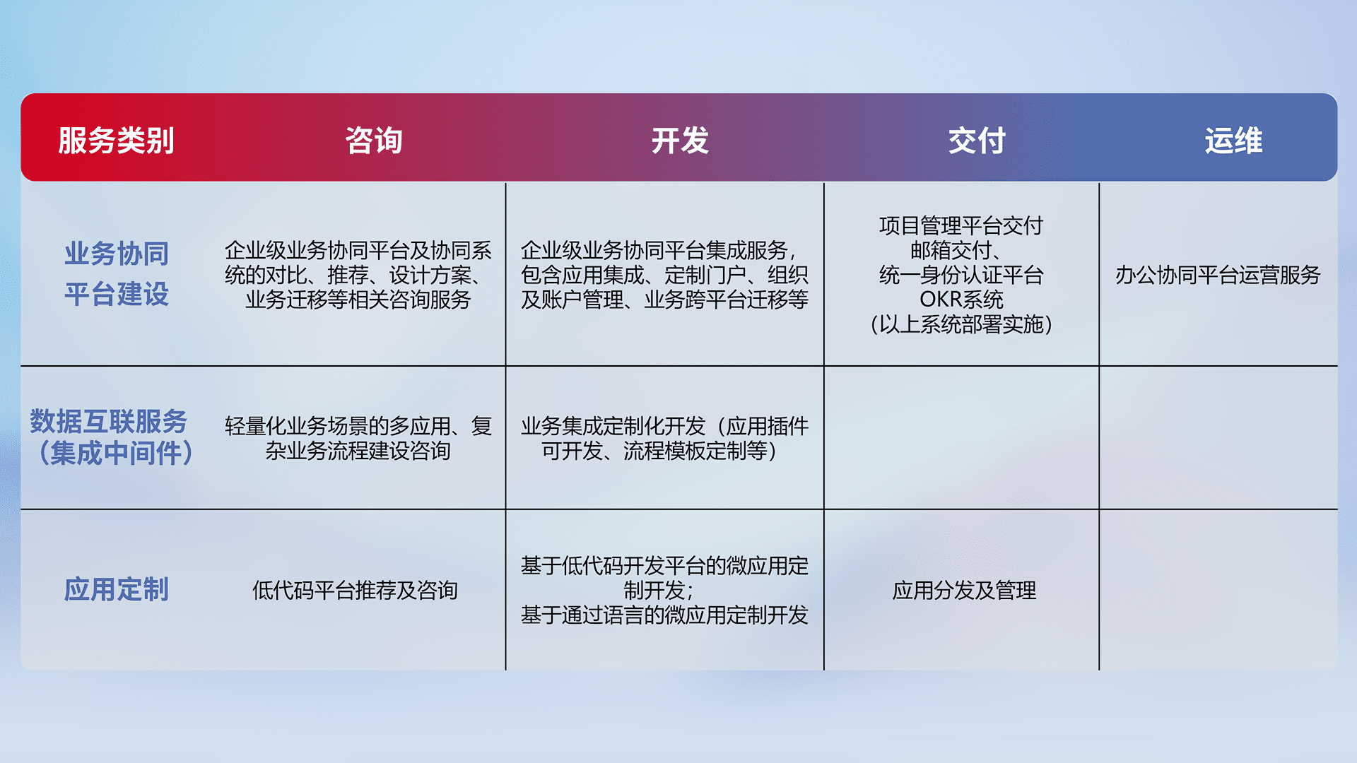 针对钉钉、、企微、、、、IDaas等平台级产品提供产品的规划、、、方案、、交付、、定制化开发等服务,,,,实现如统一协同办公、、、智能客户服务、、混合会议管理、、智能数据查询、、等业务场景,,实现数字化转型。。。。